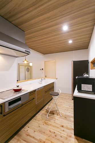 玄関ドアを開けると、框の下のコーナーに配した間接照明、左側の和室入口装飾建具がどこか料亭の趣を感じさせるホールでお出迎え。またダイナミックな片流れの屋根に、リビングの勾配天井の上部に配置した4発のサッシがアクセントになったデザイン。その勾配天井の大きな上り梁はかなりの存在感。洗面化粧台をコーナーとして、脱衣室を設けたのも便利。断熱は吹き込み式のセルロース断熱。余分な物を置かないナチュラルスタイリッシュ。